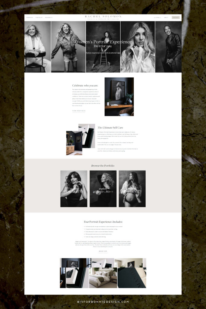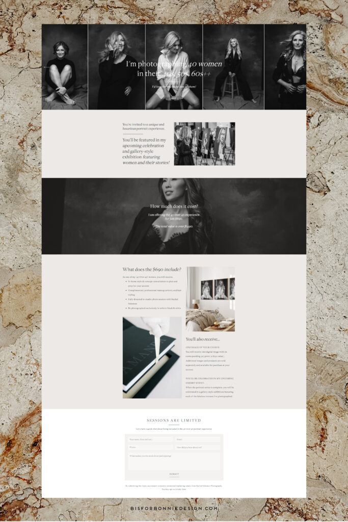 One of the most exciting parts of this project was designing a completely custom sales page for Rachel’s new 40 Over 40 Portrait Experience — a signature portrait offering created to celebrate and empower women over 40 through timeless, editorial-style portraits.